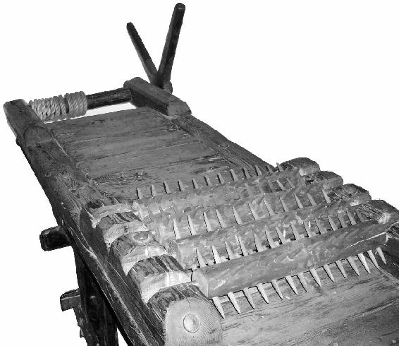 这一装置能用绞盘将受刑者“拉长”,有多种资料表明,受刑者能被拉长5英寸或者12英寸,这一长度确实不可思议,会导致手臂和腿上的每一个关节都被拉伸得脱臼,脊柱上的每一个骨节都会碎裂,当然,这也会将四肢、胸部、腹部的肌肉扯下、分离。无须太多介绍,这导致的后果是致命的。