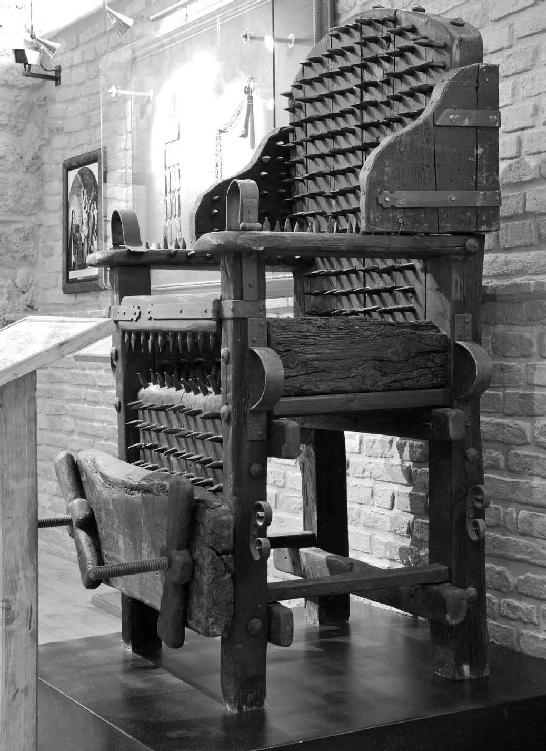 这件展品诞生于17世纪,来自于艾米利亚(Emilia)的一个城堡,1978年起成为一个意大利人的私人藏品。最近又成为意大利圣吉米尼亚诺(San Gimignano)的中世纪酷刑博物馆的藏品。犯人会被迫坐在这张椅子上——这造成的疼痛已经让人一心求死了。不过,当布满长钉的板子被牢牢钉入犯人的小腿时,疼痛会更加剧烈。这种铁椅子一般都布满长钉,而且椅子下方会被放置一个盛有炽热煤块的火盆,以使犯人更加痛不欲生。