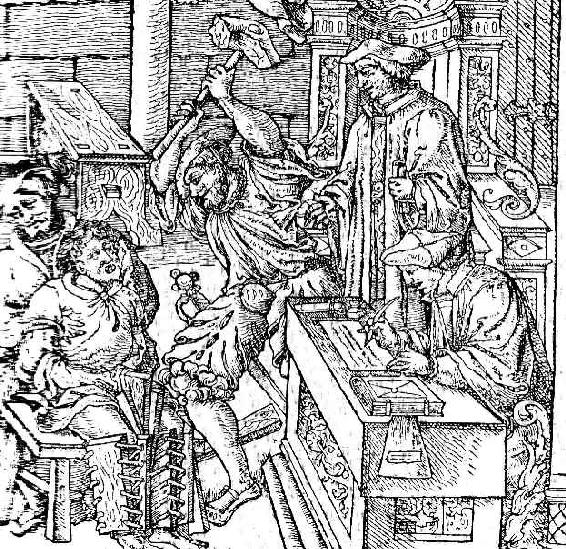 这张图片解释了审讯是如何进行的。这位犯人正在遭受名为“木靴”的酷刑。施刑人会用木板将犯人的小腿夹住,即从膝盖到脚踝的部分,然后挥舞着大锤,不断地将许多木楔子锤进木板的缝隙之中,直到犯人的膝盖骨、胫骨、脚踝骨都被挤碎了才肯罢休。这会造成犯人的极大痛苦,施刑人却故意放慢节奏,这样一来犯人就不会晕厥,因为后者故意将这种痛苦控制在不致命、不太突然的程度内。在犯人受刑期间,审讯官还会不停地问他与其“罪行”有关的问题,书记员则专注地把犯人的回答记录下来。