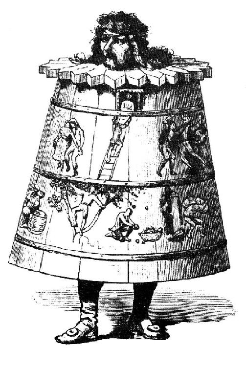 当时困扰英格兰的不仅有女巫,还有居高不下的犯罪率,各种恶行更是随处可见,詹姆士不得不严阵以待;为了使判罚与罪行相对应,他作出的某些裁决确有牵强附会之嫌,而且很有怪诞的味道。比如说,某人因酗酒而被拘捕,若是初犯,那么他只会被简单地课以5先令的罚金,但他若再次因酗酒被捕,等待这个酒鬼的惩罚则是被穿上“酒鬼斗篷”(Drunkard's Cloak)——他会被套进一个无底的啤酒桶,酒桶的顶部会被凿出一个洞,以使这个家伙的脑袋正好能伸出来。不仅如此,在一定时期内,这个家伙只要出现在公共场合,那他就必须以这种辱人的装束示人。这种木桶大到可以将一个人装下,其重量与受刑者体重相当,穿着这种“斗篷”确实极其痛苦。我们可以肯定地说,“酒鬼斗篷”是普遍施用的一种刑罚,因为晚至1690年,档案记录中仍有它的踪影。