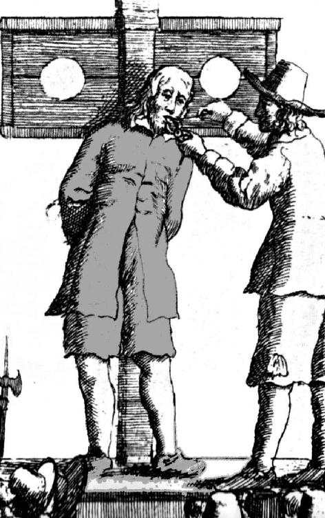 1625年,查理一世继承了其父詹姆士的王位。新国王有一些新主张,例如,他独断乾坤而不与议会协商,这是有违传统的,不过,他对犯罪和刑罚的主张却有开明的、自由主义的色彩。烙刑已经大幅减少,其他酷刑也多有降低,而且,对犯人进行刑讯逼供也成为违法行为——尽管按《大宪章》的条文来看,刑讯一直都是违法的——不仅如此,在泰伯恩刑场实施的绞刑次数也锐减,由每年的150次左右减少到约90次。不幸的是,议会对查理带来的自由主义的法律并不感冒,却因他的统治绕开了议会而耿耿于怀。法院、议会同清教徒实现了联合——后者是保守的原教旨主义者,对自由主义毫无兴趣。一位属于贵格派的国会议员威廉·普林(William Prynne),极其强调自由而有违清教信仰,1634年,他因信仰问题而被判处终生监禁。他还被处以颈手枷之刑,而且削去两只耳朵,还烙上“SL”两个字母(意为“煽动叛乱者”)。其他的贵格派信徒中,安妮·奥克兰(Anne Auckland)被判处在下水道服刑8个月,詹姆斯·帕内尔(James Parnell)则被监禁于一个离地12英尺的墙洞中。在查理一世看来,酷刑或许是违法的,但在清教徒眼中,标准化的司法程序必须以酷刑作为惩罚手段。