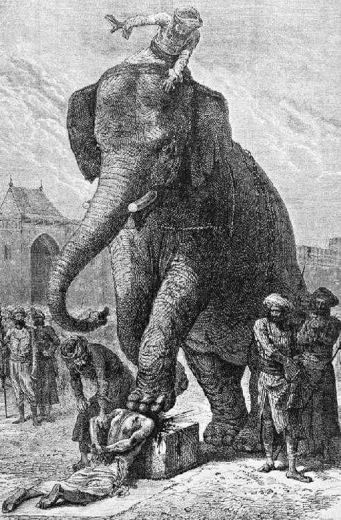印度栖居着无数的奇异且致命的昆虫和巨蟒,也是一种体型硕大、外表平和的野兽——大象的故乡。这些重达2吨的巨象看起来温顺,但却成为许多酷刑的无心的帮凶。大象在一种酷刑中扮演了类似于拉肢架的驱动的角色。用锁链把犯人的腿绑到大象后腿上,然后引导大象在院子里走动,巨大的拉力使受刑者的腿被撕扯掉,在这一血腥惨剧的末章,大象一脚踩踏在犯人头上,或直接坐在上面,把受刑者的头碾作粉尘。