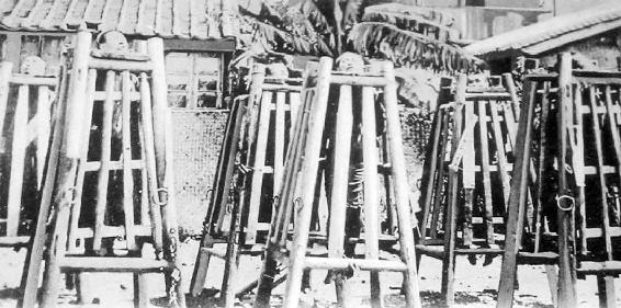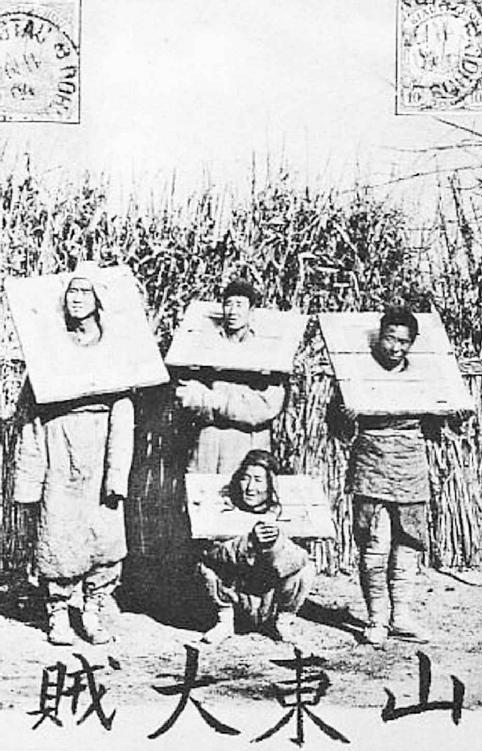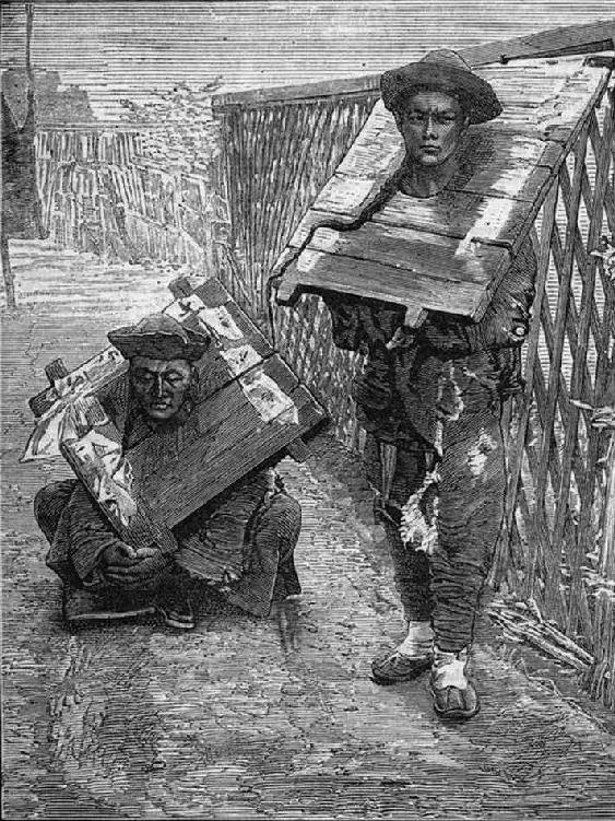这张图片出自20世纪的中国明信片。图中囚犯所戴的枷与欧洲颈手枷有些相似。