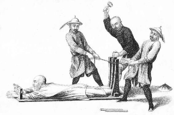 图片显示了中国版本的“刑靴”。受刑者五体投地趴在刑具上(便于实施鞭笞或其他酷刑),刽子手将楔子用力楔入固定双腿的板条中间,目的是刺断犯人的踝骨。这种酷刑可能很少在刑讯逼供中使用,它更倾向于是一种惩罚。
