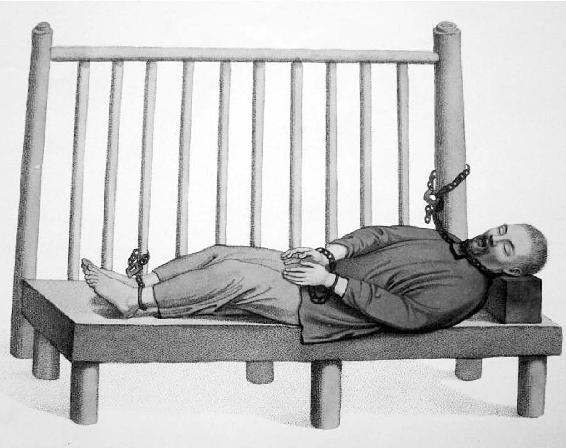 有时候,即使这样残酷的刑罚也不能奏效。一般来说,在“跪链锯”几天或几个星期之后,中国监狱里最顽固的疑犯也会松口。白天,疑犯可以在公共牢房里自由走动,晚上则被铁链拴在床铺上。他们平躺在床铺上,脚被镣铐固定在床腿上,无法翻身,为了防止犯人从脚铐中挣脱,另外给他戴上手铐,用铁链锁在墙上。还有一条铁链绕过胸前绑在床上,疑犯在夜里插翅难逃。