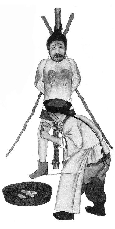 刽子手抓住受害者身上多肉的部分,如胸脯或大腿,然后把它一块块割掉。再切掉鼻子、耳朵、脚趾、手指。然后砍掉手腕、脚踝,接着是胳膊肘、膝盖、肩膀、臀部。最后,一刀捅在心脏上,再把头割掉。