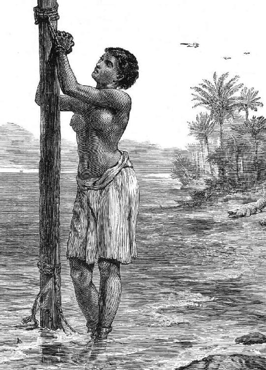 绑在木柱上的女奴,等待她的将是鞭打、烙刑,或她的捕获者所能想象到的任何其他酷刑,她还受到不断上涨的潮水的威胁,图片左下方的鳄鱼正悄然逼近。