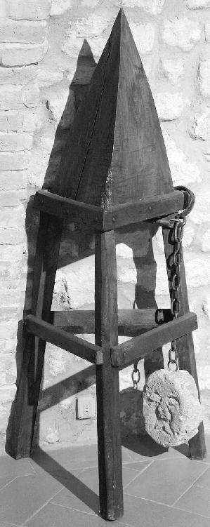 图片展示的是“犹大尖凳”。受刑者坐于其上。他们的手或脚被捆绑,脚踝上系上重物(如图片所示),使他们在塔尖上不断下陷。