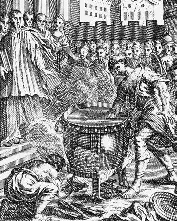 煎锅里面有油、沥青或树脂,然后生上火;当溶液开始沸腾冒泡时,不论男女,那些基督徒被一股脑地扔进锅里,像鱼一样被烧烤和煎炸。