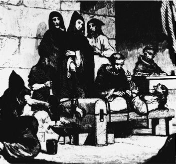 西班牙宗教裁判所从来不缺乏独具创意的刑具。“西班牙椅子”看上去跟老式的柳条编制的庭院用椅差不多,不同之处在于,它完全是铁制的。椅背、椅面以及扶手和椅腿上面有捆绑手腕、脚踝和胸部的皮带,可以把受刑者牢牢地固定在椅子上。有时候会在椅子上装上很多尖钉,能够刺入受刑者的身体。椅子底下还可以放上炭火盆,或者直接把受刑者的脚放进火盆里,进一步增加他们的痛苦。为了防止受刑者的脚快速烧毁,会在他们的脚上涂上油或者脂肪。有人可能会庆幸地说,幸好这种刑具只出现在西班牙宗教裁判所。事实上,德意志、法国和许多中欧国家都有它的踪迹。有资料显示,甚至英国也用过这种刑具,直到18世纪才废止。