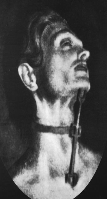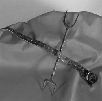 这种颇具创意的刑具用来处死被判为异端的人。它看上去像一个皮质项圈,其右侧末端安着两个叉子。当把项圈带到犯人脖子上后,叉子的一端就会插进下巴下端,另一端插进喉咙下面的喉窝处,一直顶到锁骨上。如果受刑者想低头或者摇头,叉子会更深地刺入肉里,甚至戳到喉咙里。叉子的长度不足以伤害致命部位,其意只在制造难以忍受的痛苦。