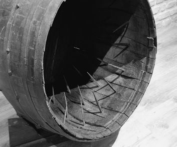 钉桶的恐怖超乎想象。刑具很简单,一个内部插满长钉的普通木桶或卷筒。行刑时,把受刑者装进里面,然后从斜坡上滚下去或者扔到海里。马库斯·雷古拉斯(Marcus Regulus)就是这样被杀害的。公元前256年,在埃克诺姆海战胜利之后,罗马执政官马库斯·雷古拉斯认为攻占迦太基(Carthage)已经没有障碍。然而,罗马军队却在接下来的布匿战争(The Punic Army)中受到重创,雷古拉斯也被俘。他在迦太基度过了5年的牢狱生活,后来迦太基人同意放他返回家乡,让他努力达成迦太基和罗马之间的停战。临走前他许下诺言,如果谈判失败,会再返回迦太基来当囚犯。迦太基人信任雷古拉斯,因为他在这5年中非常顺从,他们确信雷古拉斯会为他们效力。然而,在罗马的元老院会议上,雷古拉斯却鼓励罗马奋勇抗击迦太基人,要求他们不要接受停战。雷古拉斯达到了他的目的,但他的话也传到了迦太基人耳中。当他回到非洲时,虽然辩称自己有责任为罗马人效力,还是遭到了残酷的报复。