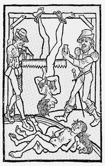 对这种酷刑其实无须太多介绍,除了在绘画中之外,现实中已很少见到了。不过,这的确是一种死刑方式,其过程是非常缓慢而痛苦的。受刑者往往倒挂着,刽子手从他的腹股沟开始拉锯。由于受刑者的血液还在循环,还能呼吸,因此直到心脏或肺部被锯时,他才会痛苦地死去。