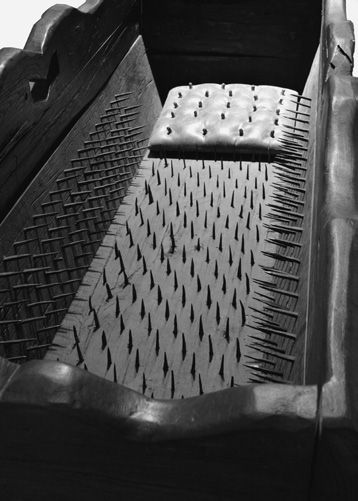 这种怪异的刑具只在德国出现过,那些没有钱制造“铁处女”的城镇可能会使用这种刑具。它的外形非常恐怖,像一个大号的婴儿摇篮,由几块矩形大木板组成,底下安装着摇动装置。木板内壁上布满锋利的铁钉。当受害者赤身被推进去后,摇篮就剧烈地前后摇晃起来,其结果不言而喻。