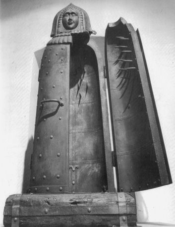 铁处女是德国人发明的,15世纪前后诞生于纽伦堡。它的外形看起来很像埃及的木乃伊棺材。外壳雕刻成女性形象,门和棺材的内壁上全是4~6寸的长钉。当受害者被推进去后,门一关,他们立刻受到来自各个方向的穿刺。这个刑具的目的不是立刻刺死受害者,因此长钉经过了精心设计,不会刺入心脏。行刑人可能会不时地打开门,看看受刑者是否屈服。如果屈服,则拉他出来,至少还能让他活命。铁处女没有大量制作,也难以从市场上买到,因此每一个都各有特色。其中有一些专为伤人性命,而另一些可以刺穿受刑者的眼睛和脑袋。虽然这种刑具出自德国人之手,但西班牙人和意大利人也在用它,甚至早在中世纪之前,就有人制造了类似的刑具。据我们所知,类似刑具最早出现在古代斯巴达的僭主纳比斯时期。他下令以妻子爱琵加的形象铸造了一个铁制雕像,它的胳膊可以活动,打开胳膊就会露出一排排的长钉。纳比斯跟臣民谈话时,如果话不投机,就会把对方推到爱琵加的手臂间,然后手臂啪的一声关上,刺穿这个人。由于手臂的位置正好在胸部,当拔出尖钉时,受害者往往已经一命呜呼了。