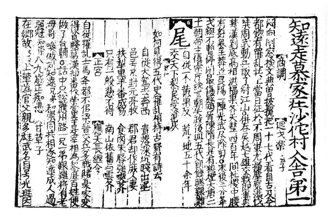 这书全文当为十二则,今存者为“知远走慕家庄沙陀村入舍第一”,“知远别三娘太原投事第二”,“知远充军三娘剪发生少主第三”(此则仅残存二页),“知远投三娘与洪义厮打第十一”,“君臣弟兄子母夫妇团圆第十二”。中间第三的大半和第四到第十的七则,则俱已佚去了。刘知远事,自宋以来,讲述者便已纷纷。今所见的《五代史平话》,己详写知远事,而诸本《白兔记》传奇,更是专述知远和三娘的悲欢离合的。大约这位流氓皇帝的故事,乃是最足以耸动市井的听闻的。