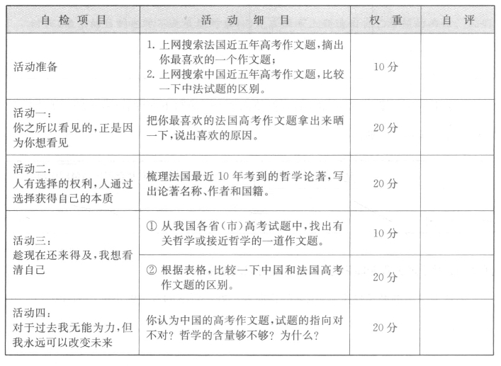哲学不是叫人接受它的结论,而是促使你思考。填写下面的表格,比较一下中国和法国高考作文题的区别: