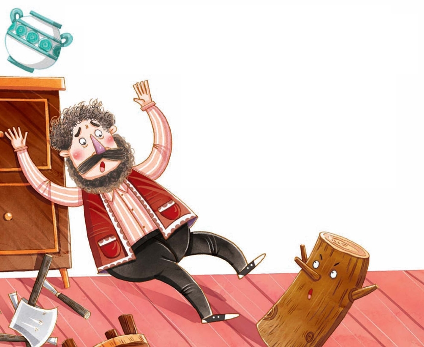 紫鼻子老头儿此时也被这叫喊声吓了一大跳,嘴巴张得大大的,舌头快耷拉到下巴那儿了。他惊讶万分地鼓着两只眼睛,将满屋子仔仔细细地查看了一遍,确信一个人也没有。他往工作台底下、柜子里、装刨花儿和碎木片儿的箱子里看了一圈,都没有人;他又走到门口往外面看了看,也没有人。“咦,这是怎么回事呢?难道我的耳朵出毛病了?”他一边独自唠叨着,一边试探着在那段木头上又砍了一下。
