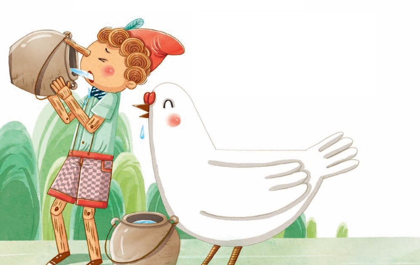匹诺曹和白鸽把住瓦罐口,大口大口地喝了起来。由于喝得太急,他们不时地被呛得直打嗝儿。