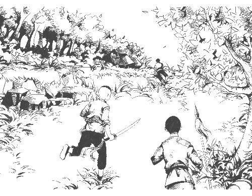 他们又转身呐喊着向寨子冲过去,连扎带砍。一个老奶奶正在寨子里摘豆角,从寨子顶上的密叶中间探出头发花白的脑袋,睁大了眼睛,惊叫道:“我的老天爷,把我的豆角都糟蹋啦!”