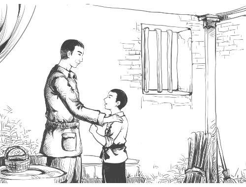 雨来把树枝抱来,噼里啪啦扔在堂屋地上,就提着要滑下去的裤子,往东屋跑。爸爸正担着一担水走到前院,叫雨来:“雨来,帮着妈妈烧火做饭啊!”
