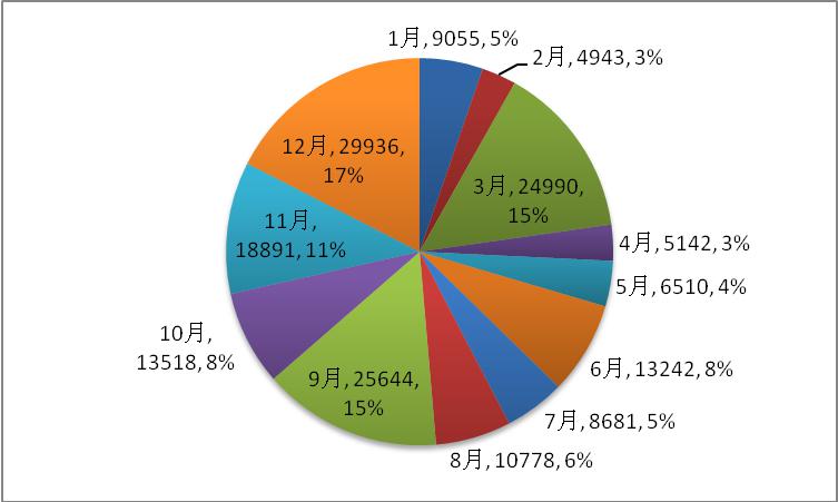读秀学术搜索的重要特征在于文献传递,即很多时候用户获取文献全文需要依赖于文献传递。2020年,读秀学术搜索的文献传递情况如图所示,文献传递总量达到171330页,秋季教学期间(9月至12月)文献传递量占比较大,约占全年传递总量的一半(51%)。