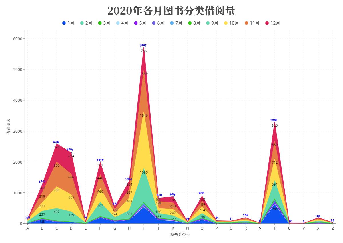 图4-10 2020年各月图书分类借阅量