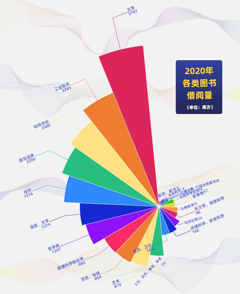 在各学科分类排名中,文学图书(I类)借阅量达5707册次;其次是工业技术(T类),借阅量为3285册次。2019及2020年全校各类图书借阅对比情况参见表4-8,2020年各类图书借阅情况参见图4-12。