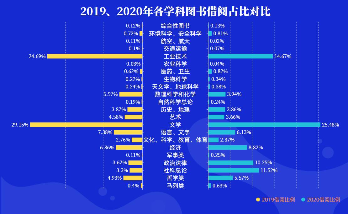 图4-11 2019、2020年各学科图书借阅占比的对比