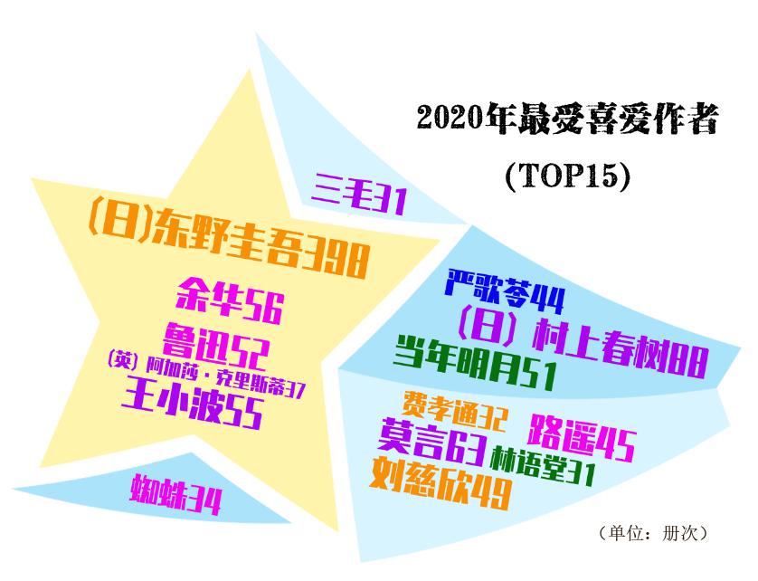 2020年,最受我校读者欢迎的作者是日本著名作家东野圭吾,他的各种图书全年借阅量合计达398册次。我国作家莫言、余华、王小波、鲁迅等亦位居前列。热门作者排名参见表4-12、图4-15。