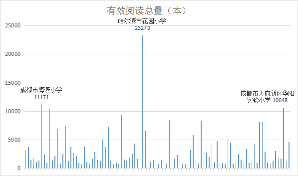 在全国参与机构中,哈尔滨市花园小学、成都市海滨小学和成都市天府新区华阳实验小学的有效阅读总量位列前三名。另外,苏州工业园区星洋学校、莆田市城厢区霞林学校、长岭县实验小学、成都市泡桐树小学西区分校、宁波市鄞州区宋诏桥小学和邳州市奚仲路小学的有效阅读总量在8000本以上,位列前9名。其他排名前100的机构的有效阅读总量均在700本以上。