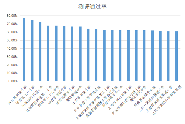 测评是线上阅读活动中检验学生阅读效果,提供阅读大数据分析的手段和数据来源之一。测评通过率是反映学生阅读能力、学校和学生对阅读测评积极性的指标之一。由上图可知,在全国测评通过率排名前20的机构中,六合区实验小学以77.64%的测评通过率位居第一,其他排名前20的机构中,测评通过率达到61%以上。