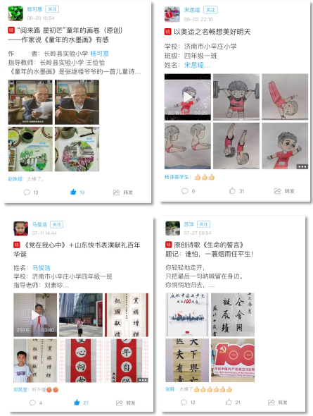 活动期间,全国活动用户分享活动相关作品(手抄报、思维导图、故事续写、故事新编、读后感、诗歌、影评、手工等)21万余条。这些作品包含写作、绘画、手工、书法、朗诵、表演等,表达了对历史的传承、探索和对未来的希冀、展望。全国参与机构中,产出量排名前20的机构见下图: