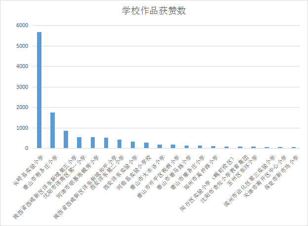创作者拥有温暖而又巨大的力量,其创作的优秀作品引起强烈的情感共鸣,而点赞即是对作品认可及支持。活动期间,不同类型、风格的创作作品深受广大用户喜爱,累计获得17527个赞,各机构的产出获赞情况不一,获赞数排名第1的机构与其他机构差距比较大。由上图可知,长岭县实验小学的获赞数最高,高达5676个赞。唐山市荆各庄小学、西安沣东第二小学、陕西省西咸新区沣东新城第五小学、沈阳市浑南区第一小学、河津市铝基地毓秀小学和陕西省西咸新区沣东新城和平小学的获赞数均在500个以上。