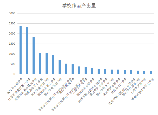 阅读是对知识内容的吸收过程,写作和其他形式的产出是对知识内容的转化和强化过程。活动期间,各机构的产出情况不一,产出率排名前20的机构的差距也比较大,一定程度上反映了各机构对产出的重视度不一。由上图可知,长岭县实验小学的产出量最高,高达2390份作品。沈阳市浑南区第一小学、河津市铝基地毓秀小学、河曲县实验小学校和邳州市奚仲路小学作品产出量也在1000份以上。