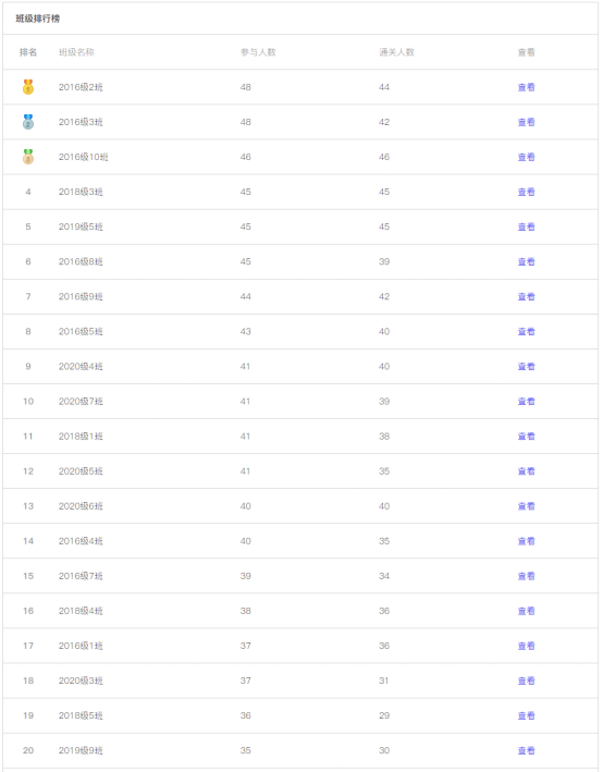 参与活动的64个班级中,有35个班级的参与人数超过30人,其中2016级表现最为突出,共有443名学生参与闯关。2016级2班以参与48人,通关44人的成绩位居学校测评数据榜首,其余班级参与数据差异不明显,表明该校重视阅读,整体阅读氛围比较浓厚。学生在活动过程中能做到深度阅读,保证阅读效果。
