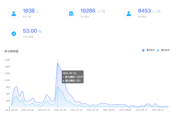 活动中,学生借助超星校园阅读系统的阅读测评体系检测阅读效果。从该校的阅读测评数据可知,该校的整体参与情况良好。该校学生的测评通过率为44.03%,平均答题正确率为53.47%。从学生整体的测评通过率及答题正确率来看,该校学生在活动参与过程中基本能做到阅读了解图书,但在测评检验环节还有待提升。