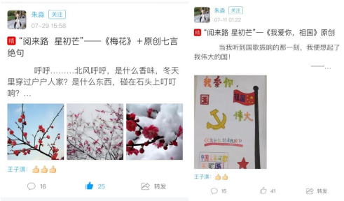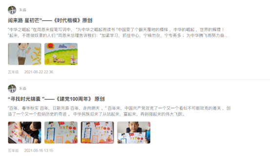 暑期活动中,长岭县实验小学2016级10班的朱淼同学在活动中积极参与,在创作分享及小组交流板块累计发表41份作品,累计获得624个赞,荣获“闪亮小作家”奖项。在“寻找时光锦囊”课程学习板块,朱淼同学以视频观看时长629.4分钟,章节学习次数211次的成绩排全国第28名,荣获“红色先锋”称号。其中,朱淼同学的妈妈积极参与亲子共读,带领孩子参与刘教授经典导读课程之《城南旧事》共读分享活动,坚持分享21天。2016级10班的指导教师王俭怡老师积极组织该班学生参与活动,并悉心指导学生发布优秀作品。以下为朱淼同学部分优秀作品展示:
