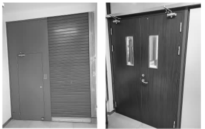 按其开闭状态,可分为常闭防火门和常开防火门。常闭防火门平常在闭门器的作用下处于关闭的状态,因此火灾时能起到阻止火势及烟气蔓延的作用。常开防火门平时在防火门释放器作用下处于开启状态,火灾时防火门释放器自动释放,防火门在闭门器和顺序器的作用下关闭(图3-63)。