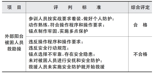2)场地器材 距离建筑入口10 m 处标出起点线,起点线放置M 形折叠梯1 把、救生软梯1 套、挂钩梯1 把、安全绳6根、安全腰带3 根、喊话器1 个。