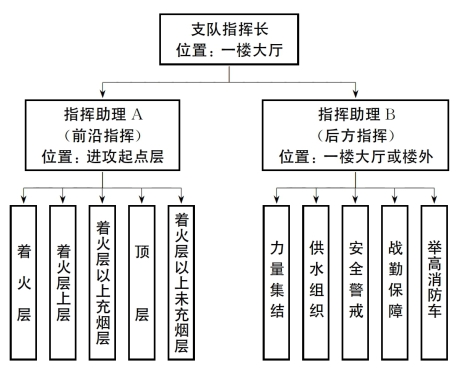1)中队指挥 出动途中,指挥员A 向指挥中心、起火单位了解、核实现场人员被困情况,查询建筑有关信息,进行初战力量部署,明确车辆停靠位置,提示行动注意事项。到场后,指挥员A 首先组织侦察研判情况,续报消息,然后部署车辆作战任务和指挥员指挥任务,应在4 个“关键点”设立指挥位置,即着火建筑一楼大厅、消防控制室、进攻起点层和建筑外围。