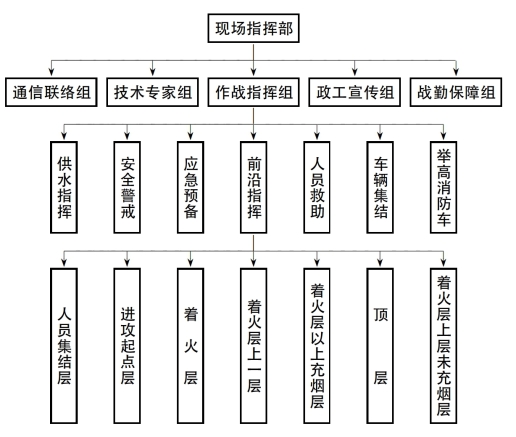 4)作战指挥组 由全勤指挥部指挥长负责,主要负责统筹现场指挥员做好供水指挥、安全警戒、应急预备、前沿指挥、人员救助、车辆集结,以及举高消防车指挥等工作。在一楼大厅建立前沿指挥部负责作战指挥,主要负责调整楼层指挥分工,增设人装集结层,并分别在人装集结层、进攻起点层、着火层、着火层上一层、着火层上层充烟楼层、顶层、着火层上层未充烟的楼层设置指挥力量。