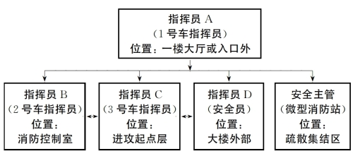(1)指挥员A(1 号车指挥员)为中队指挥员,指挥位置一般设置在商务建筑一楼大厅或居住建筑一楼入口外,便于上下、内外信息沟通和统筹指挥。主要负责本中队及初期到场其他力量的统筹指挥工作,具体做好出动途中信息核对、组织侦察、信息报送、指挥中队整体作战,以及给增援力量安排作战任务,同时协调将微型消防站等单位应急力量纳入指挥体系(具体负责外部人员疏散集结区设立及人员清点工作)。