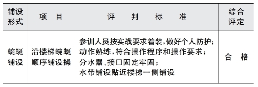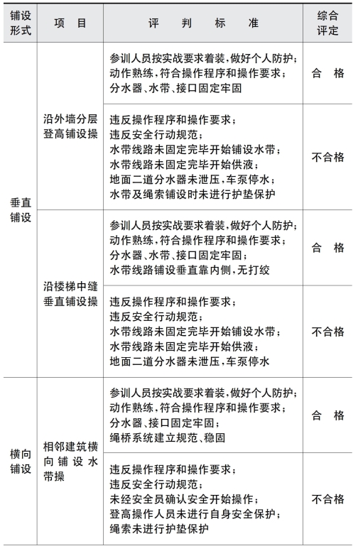 2)场地器材 在距建筑入口20 m 处平地上标出起点线,在建筑11 层楼面标记人员装备集结层,12 层楼面标记预备进攻层,14 层以上为着火层。在首层起点线上放置空气呼吸器20具、备用气瓶40 个、40 m 干线水带2 盘、20 m 支线水带20 盘、30 m 安全绳2 根、二分水器5 个、水枪10 把、止水器5 个、65 mm 内扣转65 mm 雌卡接口5 个、手提式强光照明灯20 个、泛光灯2 个、无齿锯2 把、备用锯片6 片、热成像仪3 台、排烟机1 台、担架2 副、喊话器1 个、警戒桶2 个、饮用水若干、分类标志牌若干、白板若干、油性笔若干等器材。