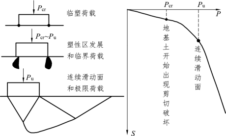 图4.11表示由荷载试验测得的P-S曲线。典型的P-S曲线可分为按顺序发生的三个阶段:压密变形阶段、局部剪损阶段和整体剪切破坏。三个阶段之间存在着两个界限荷载。第一个界限荷载,标志着地基土从压密阶段进入局部剪损阶段。当荷载小于这一界限荷载时,地基内各点土体均未达到极限平衡状态。当荷载大于这一界限荷载时,位于基础下的局部土体,通常是基础边缘下的土体,首先达到极限平衡状态,于是地基内开始出现弹性区和塑性区并存的现象。这一界限荷载,称为临塑荷载,用Pcr表示。第二个界限荷载标志着地基土从局部剪损破坏阶段进入整体破坏阶段。这时基础下滑动边界范围内的全部土体都处于塑性破坏状态,地基丧失稳定,称为极限荷载,等于地基的极限承载力,用Pu表示。