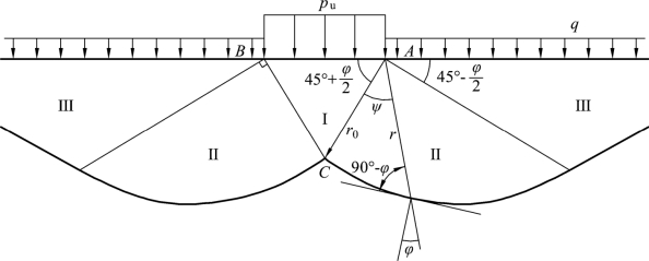 考虑受条形均布竖向荷载作用的底面光滑的条形刚性板置于无重量(γ=0)的均质地基表面上(d=0),地基材料具有刚塑性性质。当荷载板下的土体处于极限平衡状态时,滑动面形状如图4.13所示。