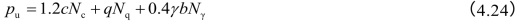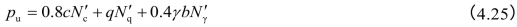 上述公式(4.23)和(4.22)只适用于条形基础。对于方形和圆形基础,太沙基建议按下列公式计算地基的极限承载力: