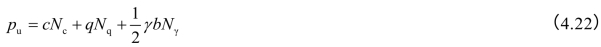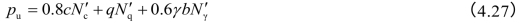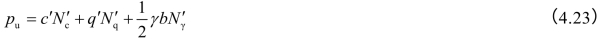 式(4.22)是在整体剪切破坏条件下得到的,适用于压缩性较小的土。对疏松的或压缩性较大的土,可能会发生局部剪切破坏。太沙基建议采用降低土的抗剪强度指标的方法对式(4.22)加以修正,即取