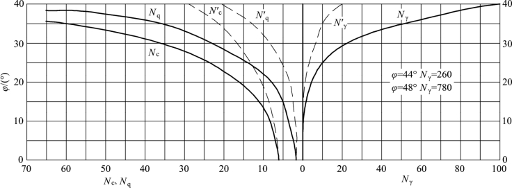 式中相当于局部剪切破坏情况的承载力系数。根据降低后的内摩擦角φ,仍可查表得到。