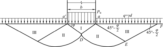 I区——由于基底与土之间有摩擦力阻止发生剪切位移,因此,当地基达到破坏并出现连续滑动面时,基底下有一部分土体将随着基础一起向下移动而处于弹性平衡状态,该部分土体称为弹性楔体,如图4.14所示的I区。此区的土不易发生剪切位移,而处于压密状态,边界αb(或ab′)与水平面夹角ψ取决于基底粗糙程度。当假定基底完全粗糙时,ψ=φ,一般情况,φ<ψ<45°+